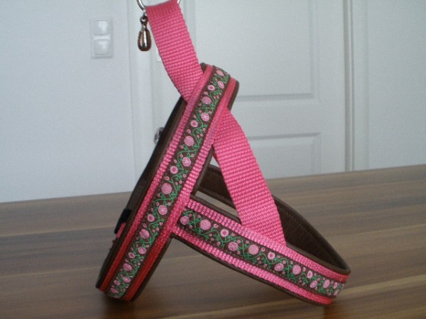 Geschirr - mit Borte Blumen auf schoko, Gurtband pink, Leder haselnuß