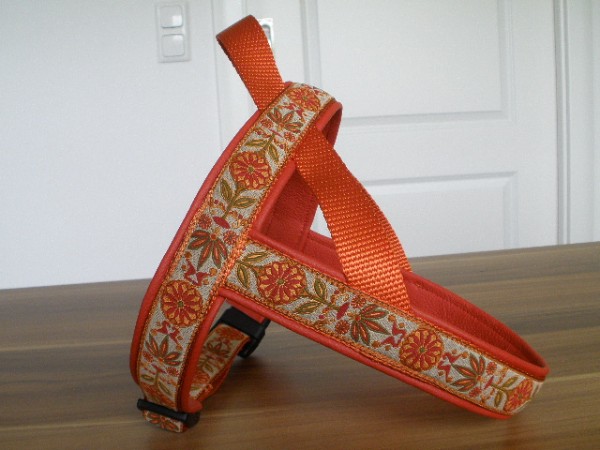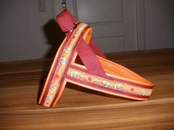 Geschirr - mit Borte Drachen orange, Gurtband weinrot, Leder orange