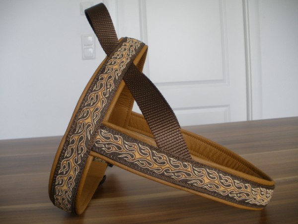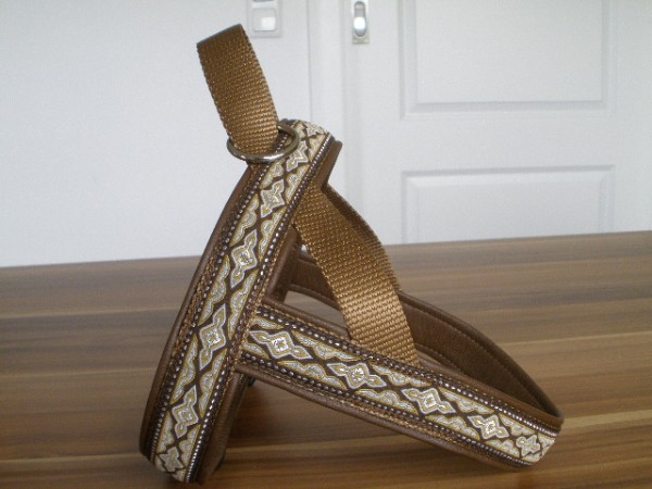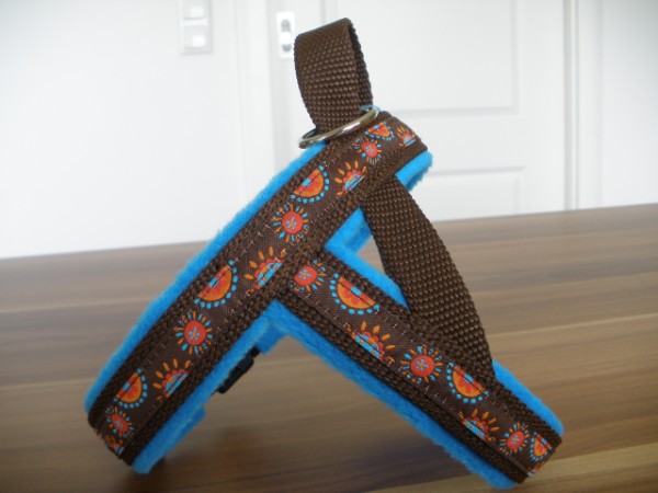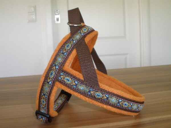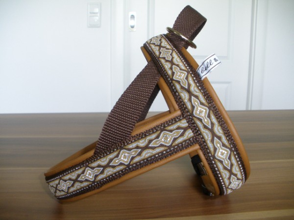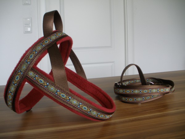 Geschirr - mit Borte Tundra bunt, Gurtband schoko, Fleece terra