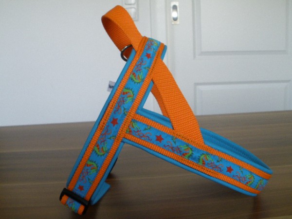 Geschirr - mit Borte Drachen türkis, Gurtband orange, Leder türkis