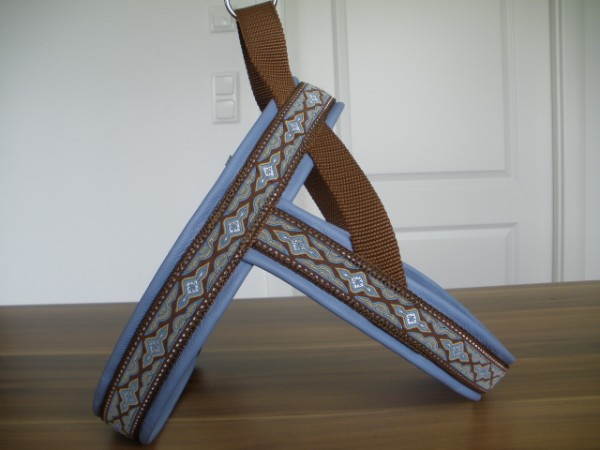 Geschirr - mit Borte Lava hellblau, Gutband schoko, Leder taubenblau