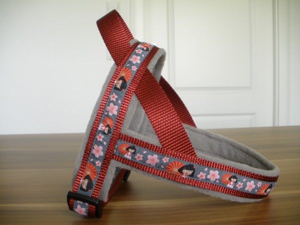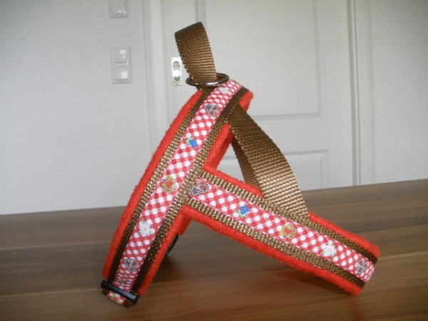 Geschirr - mit Borte Herzilein, Gurtband hellbraun, Fleece rot