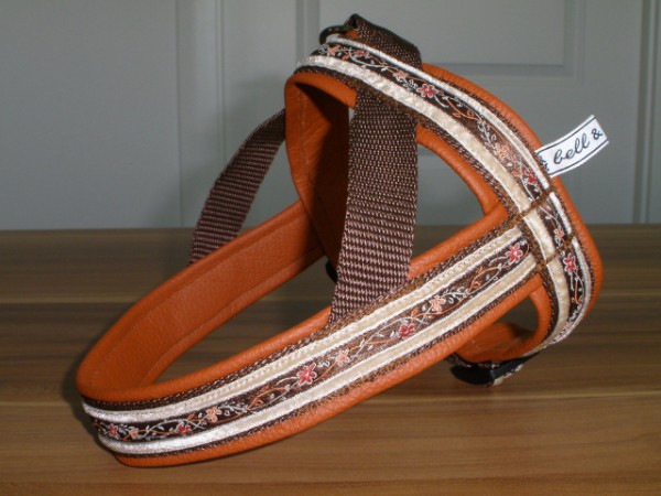 Geschirr - mit Borte Blumenranke schoko + Samtborte sand, Gurtband schoko, Leder terra