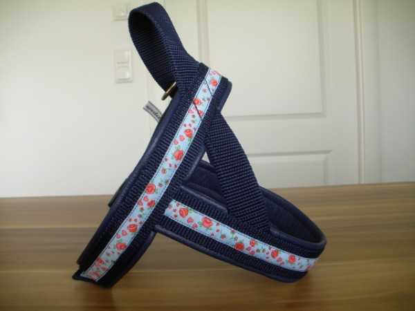 Geschirr - mit Borte Rosen hellblau, Gurtband marine, Leder marine