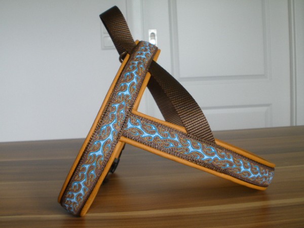 Geschirr - mit Borte Flammen blau auf schoko, Gurtband schoko, Leder honig dunkel