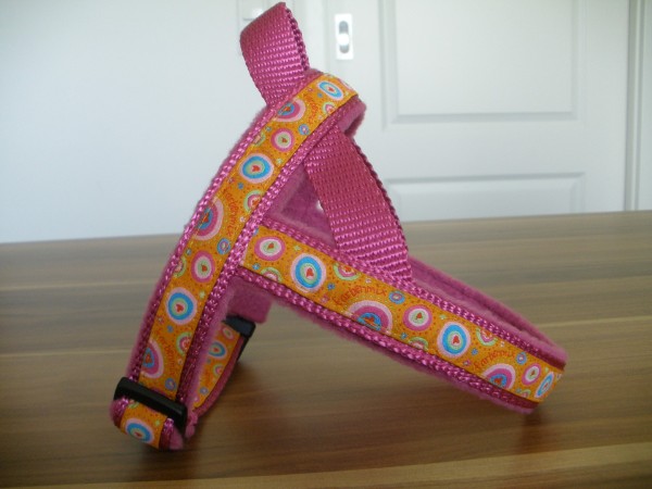 Geschirr - mit Borte Circles orange, Gurtband fuchsia, Fleece fuchsia