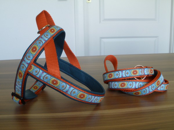 Set: Geschirr + Leine - Borte Eastwind, Gurtband kürbis, Leder petrol