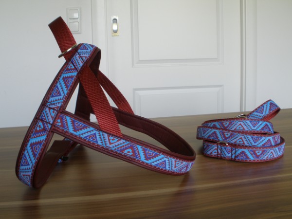 Set: Geschirr + Leine - Borte Mexiko weinrot/eisblau, Gurtband weinrot, Leder weinrot