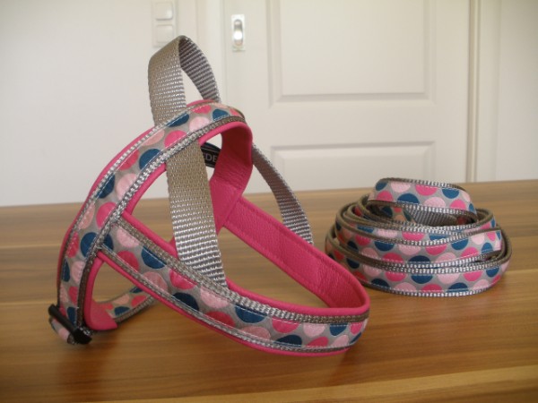 Set: Geschirr + Leine - Borte Kreise grau, Borte silber, Leder himbeer