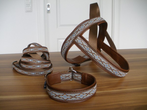 Komplett-Set: Halsband Zugstopp + Geschirr + Leine - Borte Lava braun/taube, Gurtband schoko, Leder rehbraun