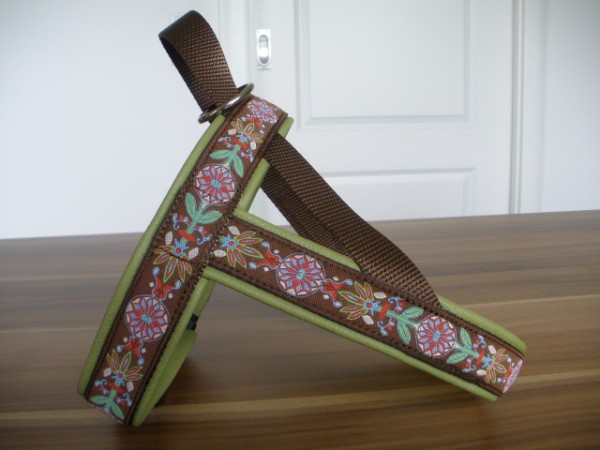 Geschirr - mit Borte wild, Gurtband oliv, Leder apfelgrün