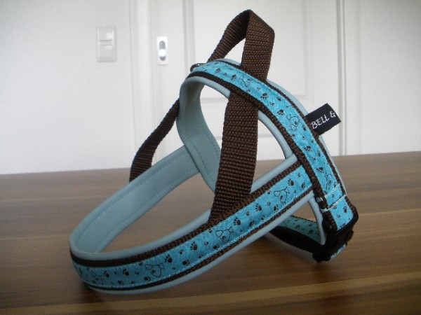 Geschirr: Borte Hund+Pfote helltürkis, Gurtband schoko, Leder babygrün
