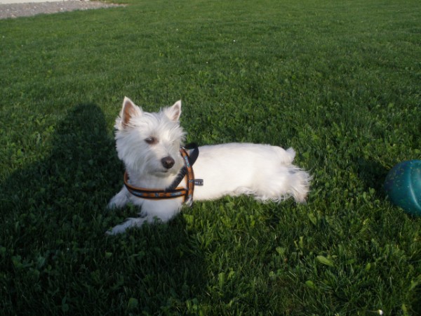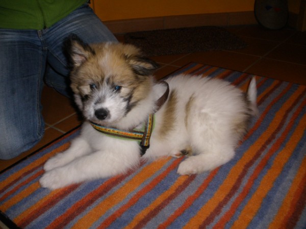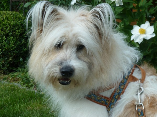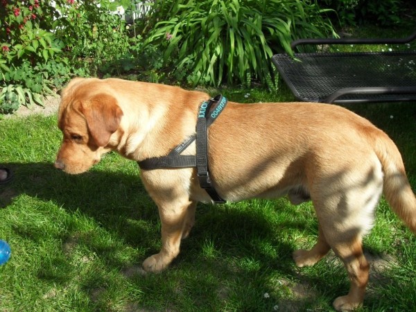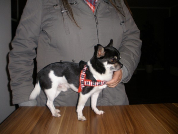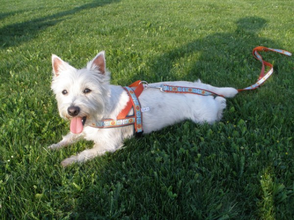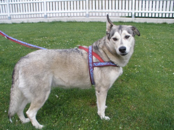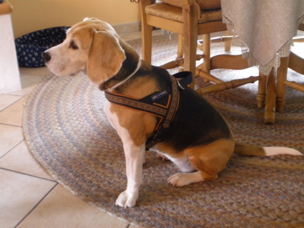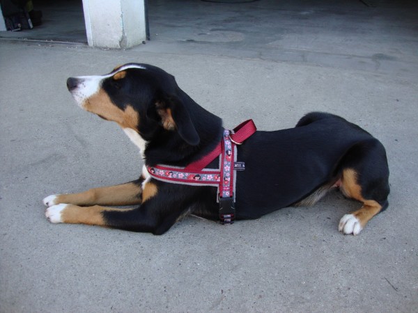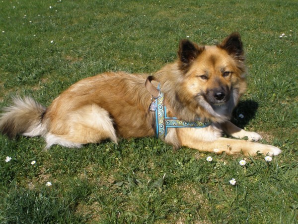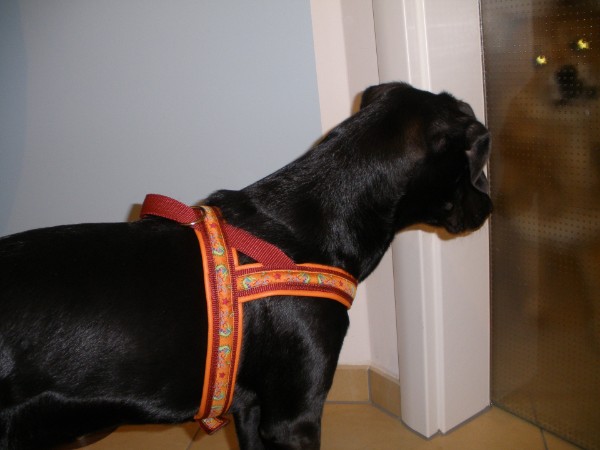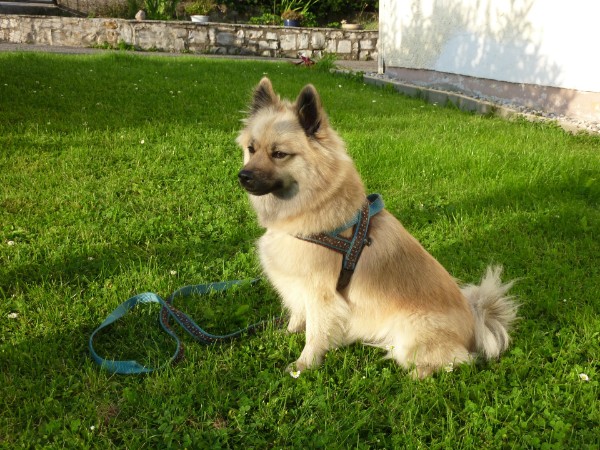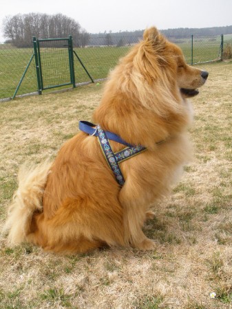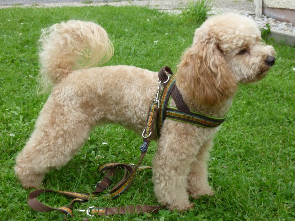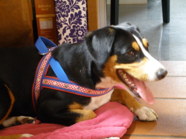 KIWI mit Geschirr - Borte Aztek, Gurtband schwarz, Leder honig dunkel (Geschirr Größe M: 43 €)