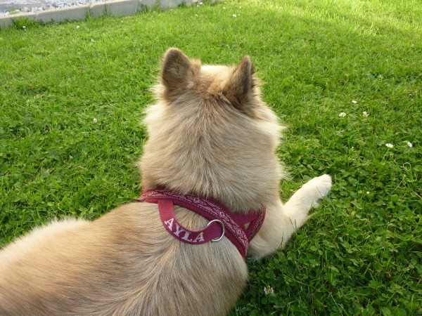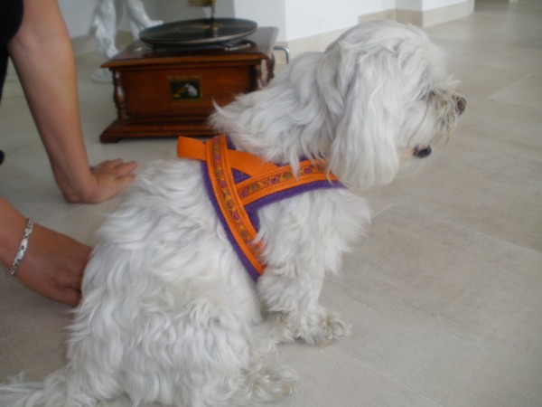 LILLI mit Geschirr - Borte Hawaii orange, Gurtband orange, Fleece lila (Geschirr Größe S: 32 €)