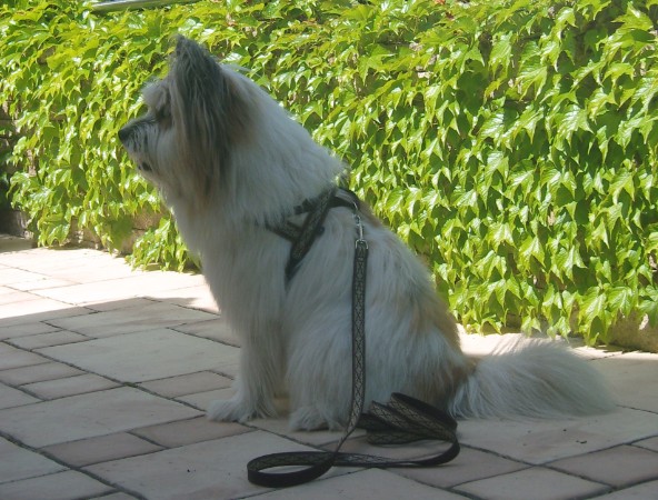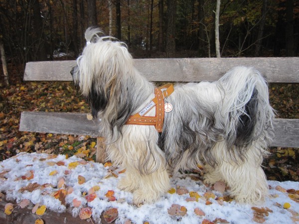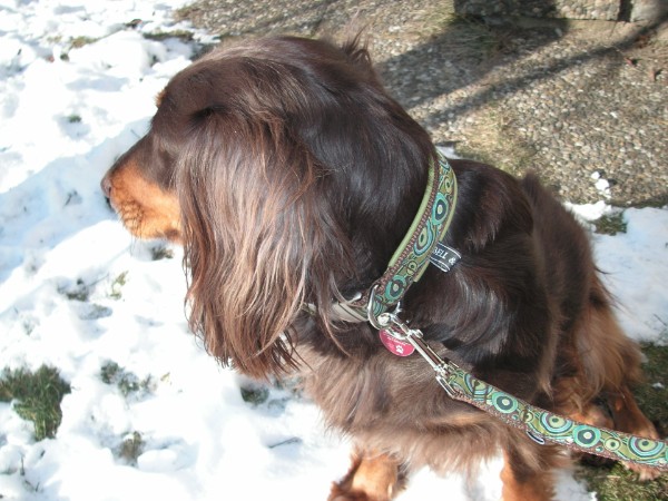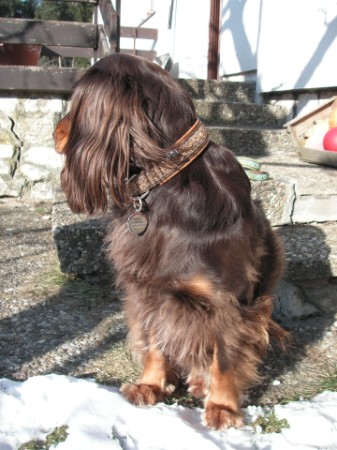 SAMI mit Geschirr + Leine - Borte Lava schoko/silber, Gurtband schoko, Leder camel (Geschirr Größe L: 50 €; Leine: 3m - stufenlos verstellbar: 29 €)
