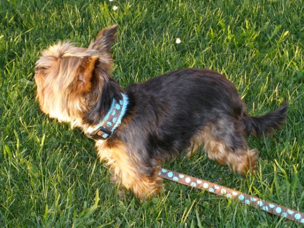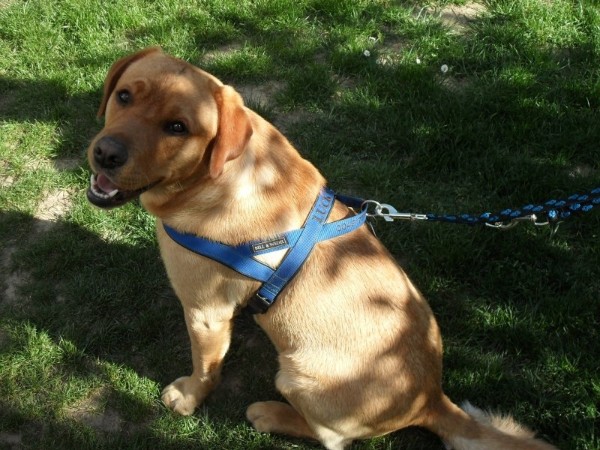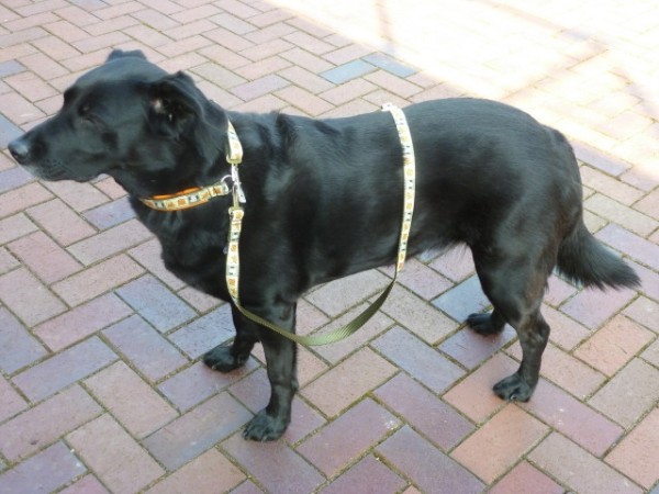 LUCKY mit Geschirr + Leine - Gurtband mittelblau, Leder schwarz, bestickt schwarz, Leine Pfotengurtband (Geschirr Größe L: 55 €; Leine: 2m - 3fach-verstellbar: 21 €)