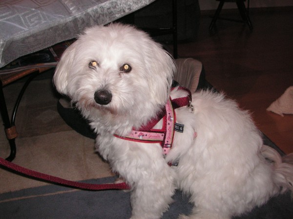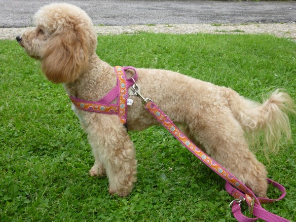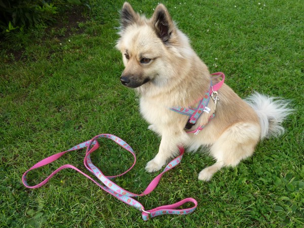 LANA mit Geschirr + Leine - Borte Glückspilz rosa, Gurtband weinrot, Leder rot (Geschirr Größe S: 40 €; Leine 2,5 m - stufenlos: 23 €)