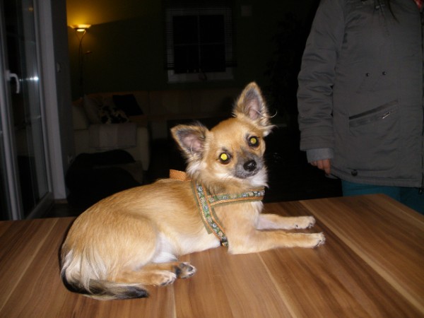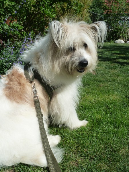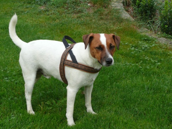 SAMMY mit Geschirr - Borte Waldelf kupfer, Gurtband schwarz, Leder camel (Geschirr Größe M: 44 €)